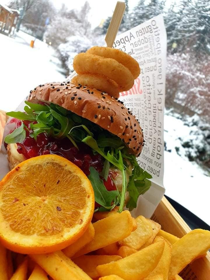 rukola, pomidor, wołowina 160g, czerwona cebula, oscypek wędzony, konfitura z żurawiny -