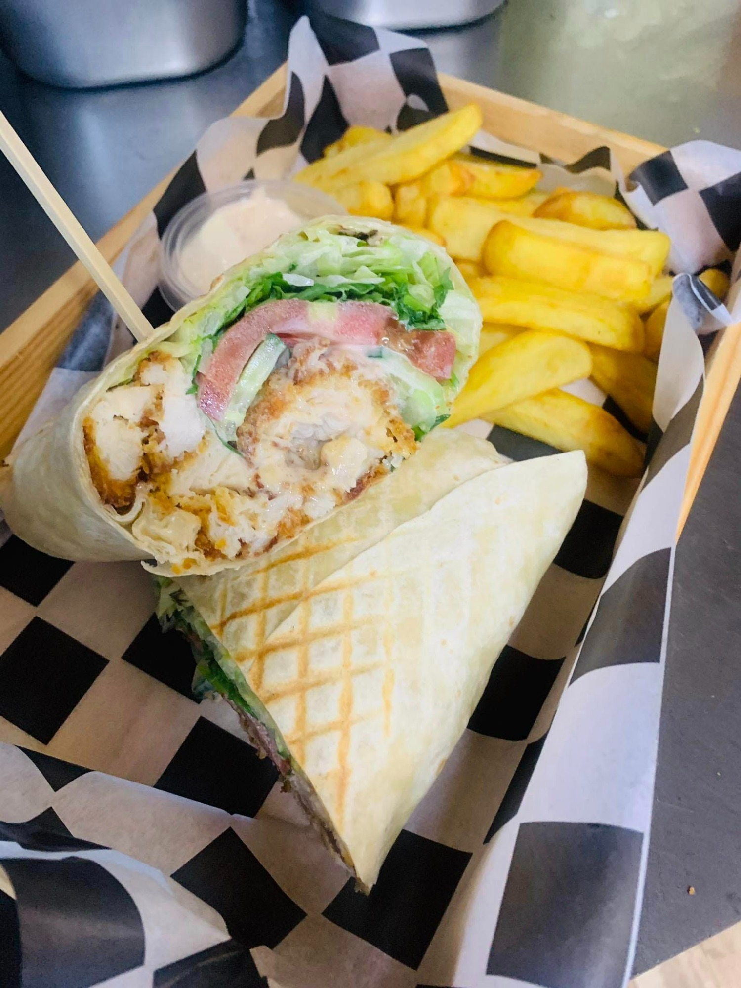 sałata lodowa, cebula czerwona, rukola, pomidor, gouda, polędwiczki z kurczaka, ketchup, dip lub sos ostry -